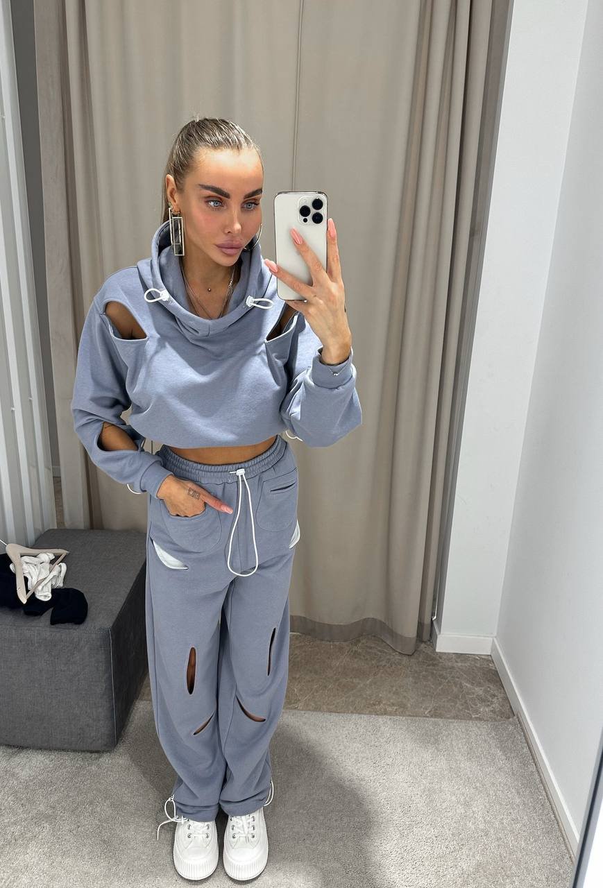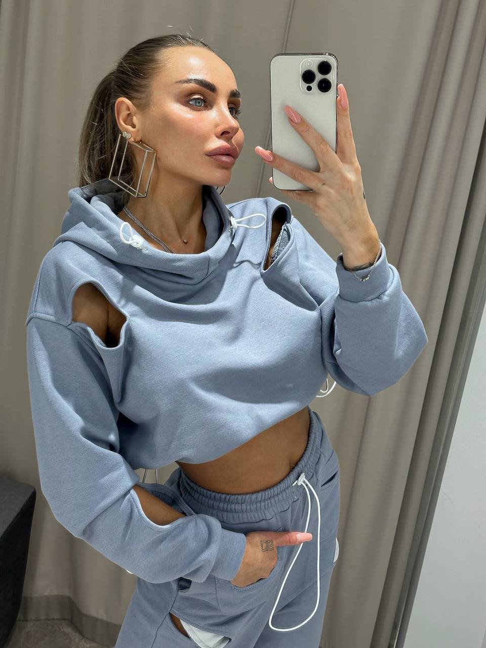 The peculiarity of this sweatshirt is the original cutouts on the shoulders and sleeves, which adds uniqueness and allows you to stand out among others. The sweatshirt has a hood and pockets that add practicality and protect from the weather. This stylish wardrobe item can be easily combined with different types of pants and skirts to create a stylish and comfortable look.