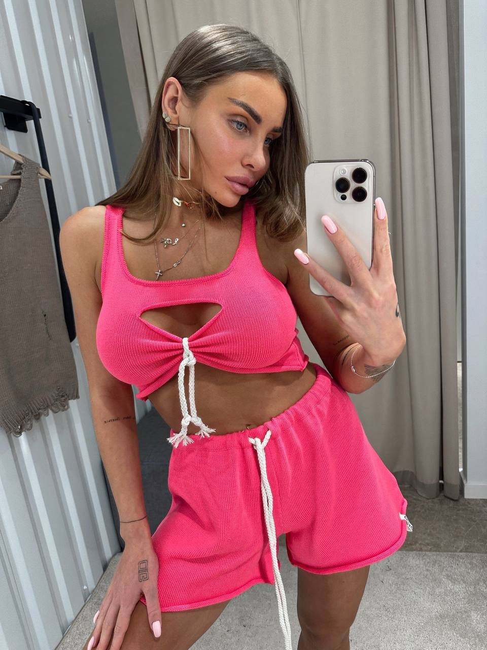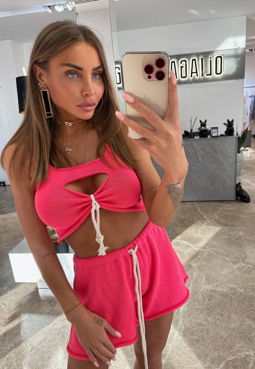 Комплект складається з топу та шортів насиченого рожевого кольору. Топ має оригінальний дизайн з декоративними прорізами та зав’язками, що додає йому особливого шарму та робить образ більш виразним.