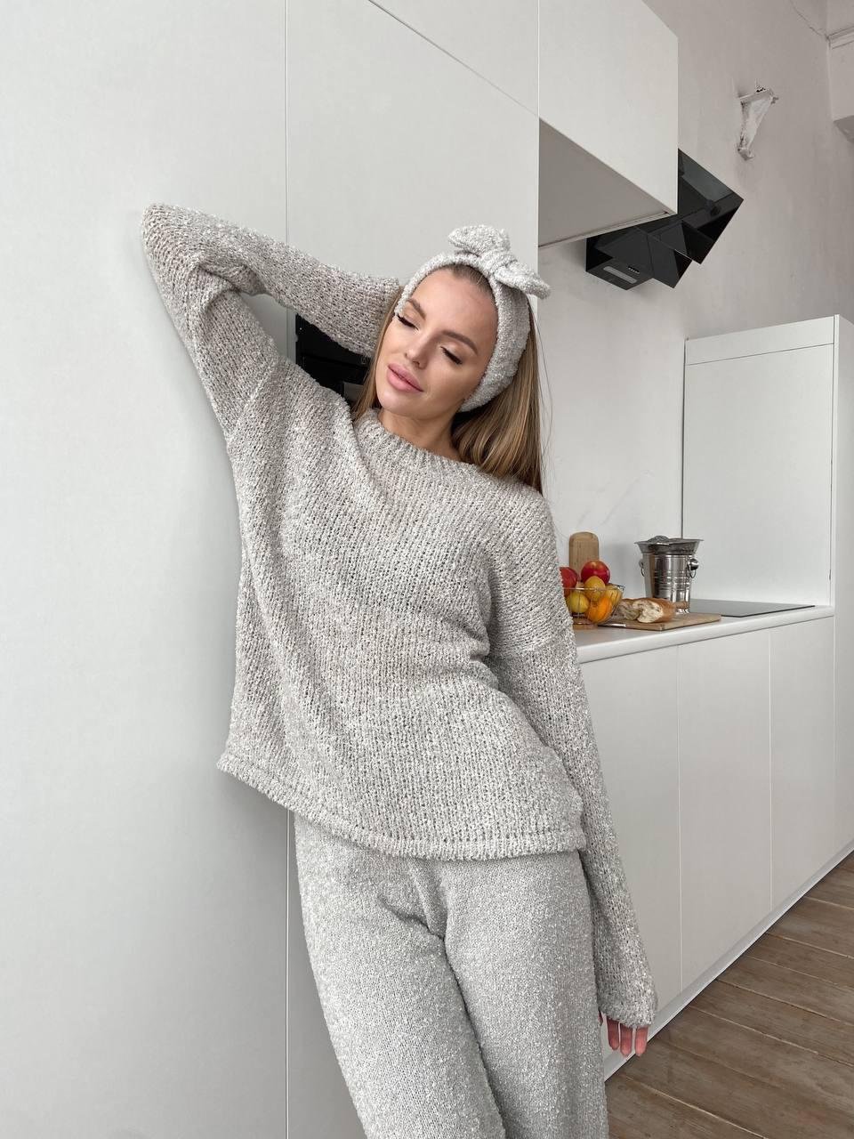 Женский костюм тройка "ЗЕФИР" выполнен из мягкой пряжи букле, обеспечивает непревзойденный комфорт и стиль. Комплект состоит из свитера, брюк и повязки на голову. Свитер и брюки имеют свободный крой, что позволяет чувствовать себя комфортно на протяжении всего дня. Декорированный фирменным шевроном, этот костюм идеально подходит как для домашнего использования, так и для прогулок на свежем воздухе. Легкий уход и удобный дизайн делают этот костюм необходимой частью вашего гардероба.
