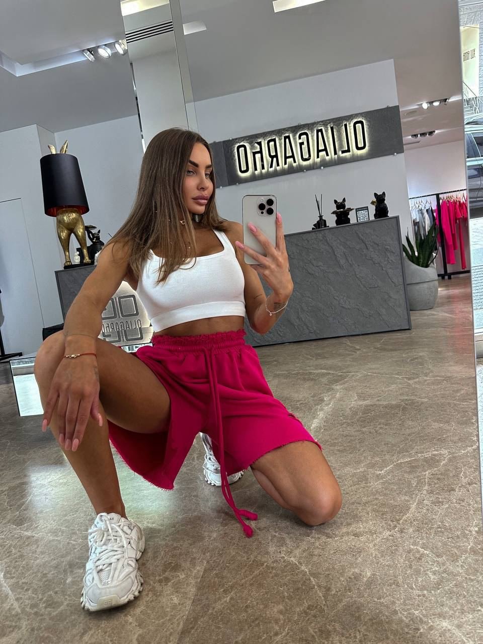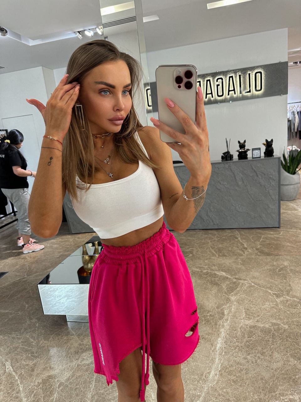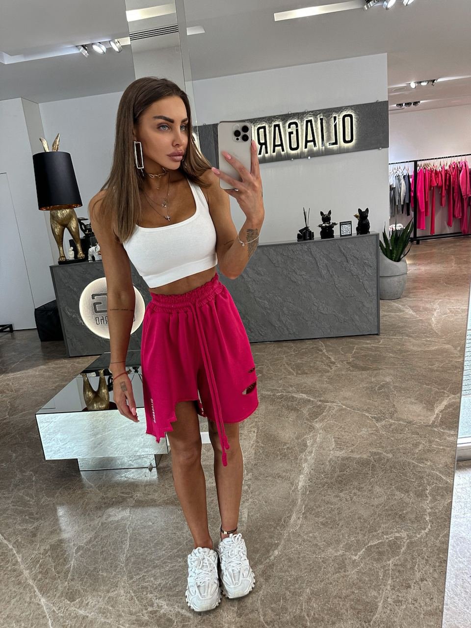 - Дизайн: Яркий и насыщенный розовый цвет с декоративными вырезами на одной из штанин, что добавляет шортам оригинальности и современного вида.
